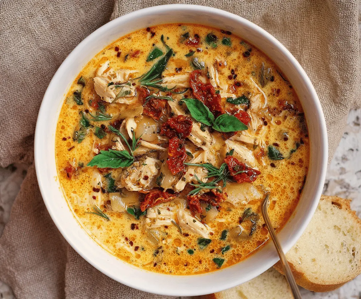 Creamy Sun-Dried Tomato Chicken Soup in a bowl garnished with fresh herbs and served with crusty bread, highlighting a delicious and comforting meal.